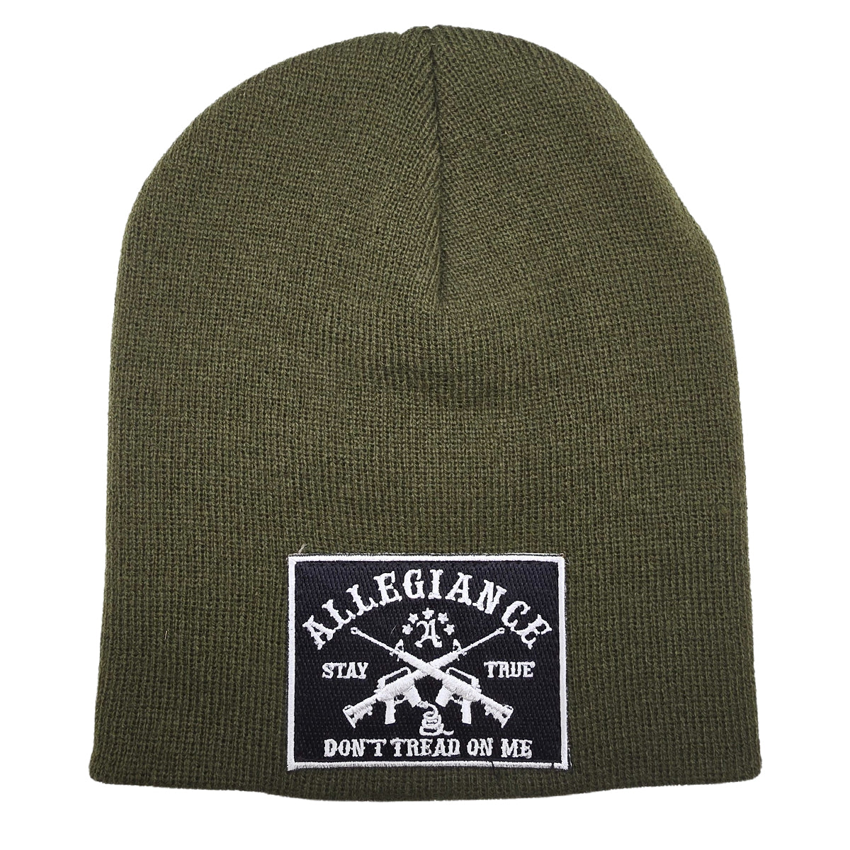 The Allegiance Don’t Tread Beanie delivers a rugged look with a bold patriotic message. Right away, the OD Green knit sets the tone with a classic military-inspired feel. The large front patch features crossed rifles, a coiled snake, and the words “Stay True” and “Don’t Tread On Me,” all framed by the Allegiance name across the top. Additionally, the high-contrast black-and-white patch creates a sharp graphic that stands out without being overwhelming.